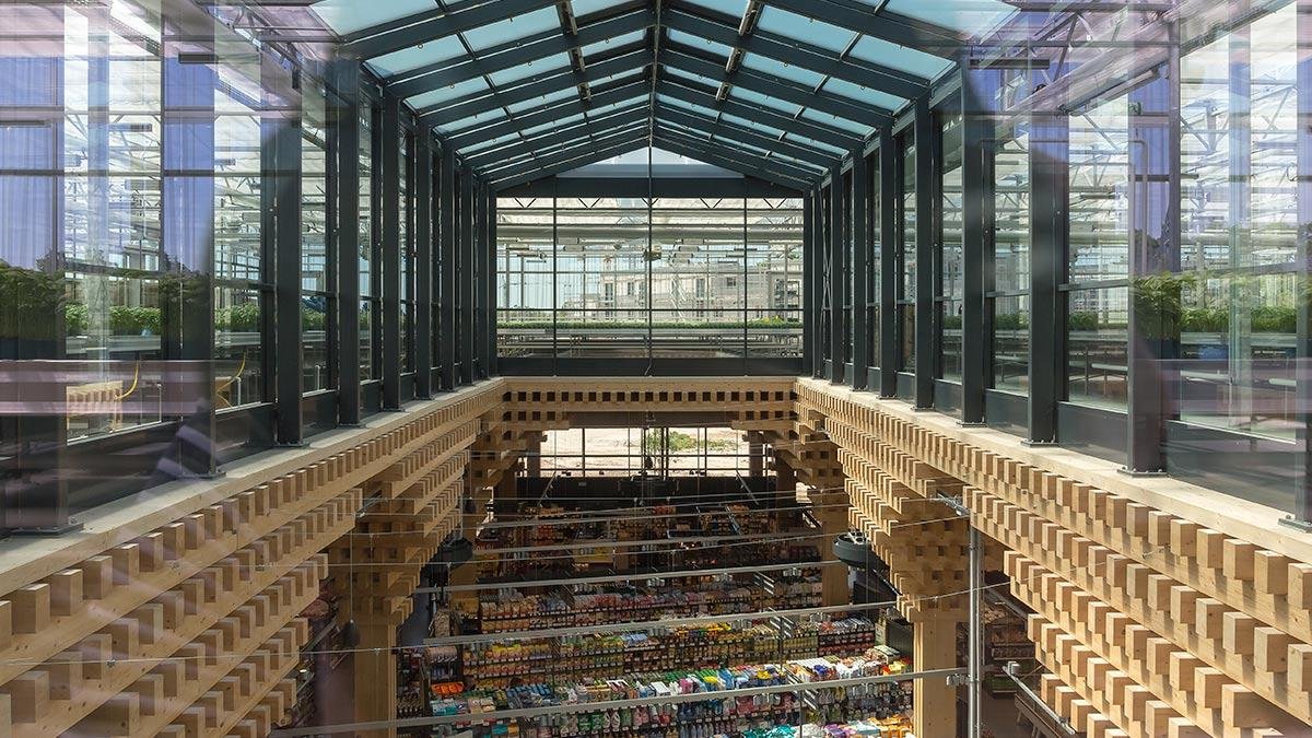 The Ville Saint-Laurent project began as a response by the German retail chain REWE to the question of how future supermarkets can become more sustainable and transparent. The idea had been developing for years through earlier Green Building concepts that REWE has implemented since 2009 at more than 200 locations, but with the Green Farming store concept in Wiesbaden the company sought to completely revise the supermarket model and incorporate food production into the very structure of the retail space. The project was planned from 2016 to 2021, and the main motivation was to combine retail with local food production, using innovative systems such as aquaponics where fish and plants, for example basil, grow in a symbiotic cycle. Basil and fish are produced directly on the roof and sold in the store or distributed to nearby branches, reducing transport distances and packaging. The system uses up to 90 percent less water than conventional agriculture, demonstrating practical ecological benefits. Architecturally, the building is constructed from large quantities of wood that store carbon, while the glass roof allows abundant natural light and a visible connection between production and sales. The example has been well received in the industry. The store received the Store of the Year 2022 award from the German Retail Federation, and REWE states that the pilot project is already achieving its economic goals and serves as the basis for a standardized model and the future construction of similar centers throughout Germany.