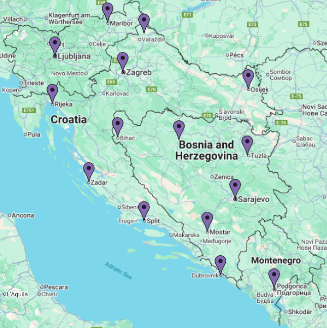 - Bosnia and Herzegovina: Sarajevo, Mostar, Tuzla, Banja Luka, Bihać